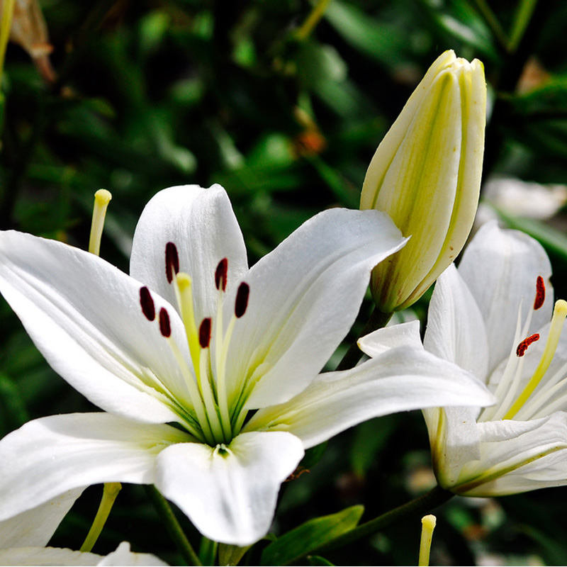 花 材:双色太阳花三扎,香水百合一朵,散尾葵适量,两层花架1只。