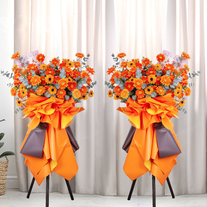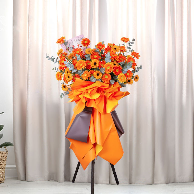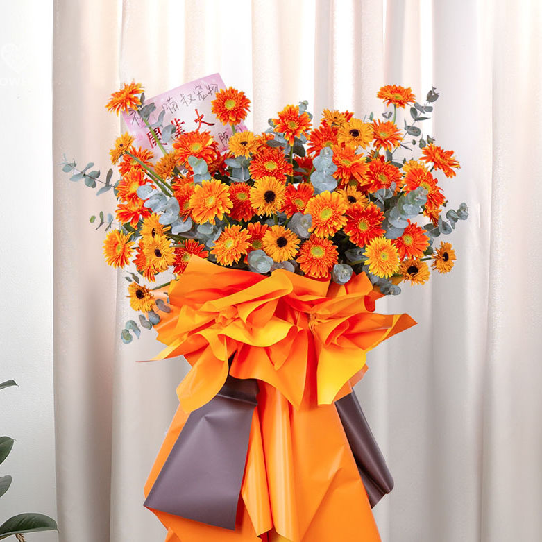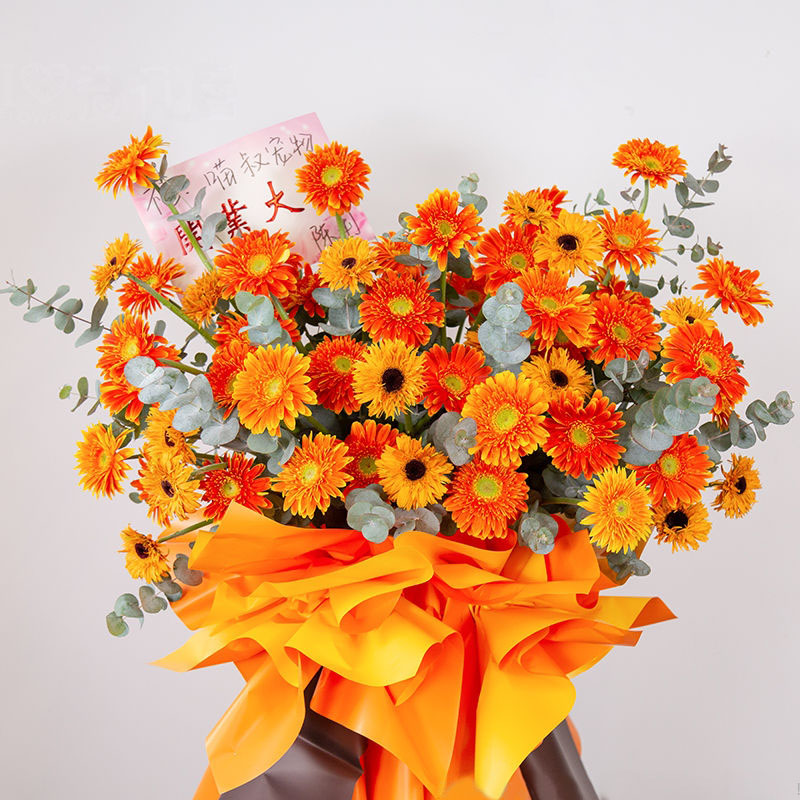 花 材:橙色弗朗花、黄色扶郎花共50支,搭配尤加利叶装饰。橙色双面纸韩式包装,同色系花结。