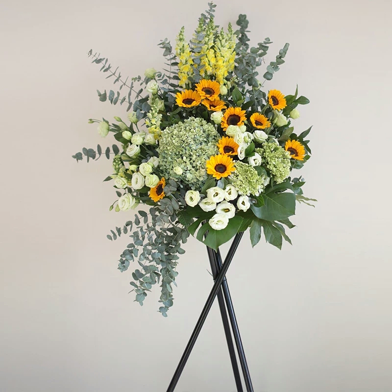 花材: 绣球2只,向日葵10支,桔梗1.5扎,尤加利2扎,绿叶等。