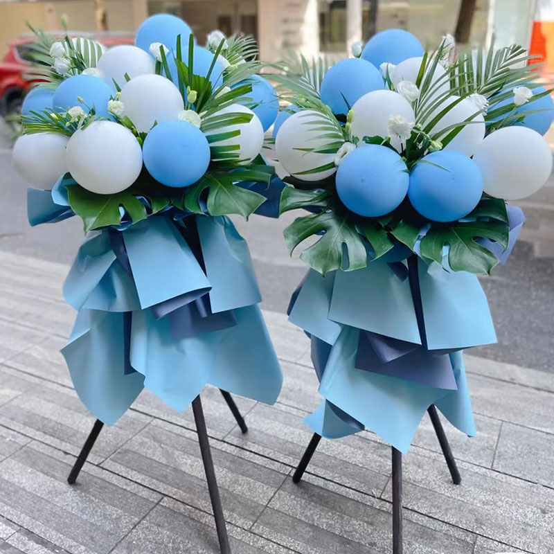 花材: 11个蓝色系、白色气球,搭配洋桔梗、龟背叶、散尾葵,蓝色包装。