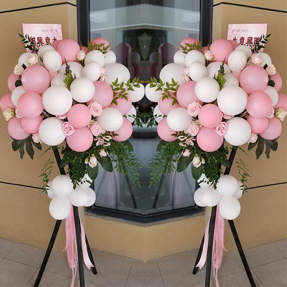花 材:16个粉气球,22个白气球,戴安娜粉玫瑰间插,龟背叶等绿叶搭配。