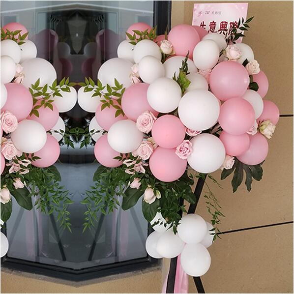 花材: 16个粉气球,22个白气球,戴安娜粉玫瑰间插,龟背叶等绿叶搭配。