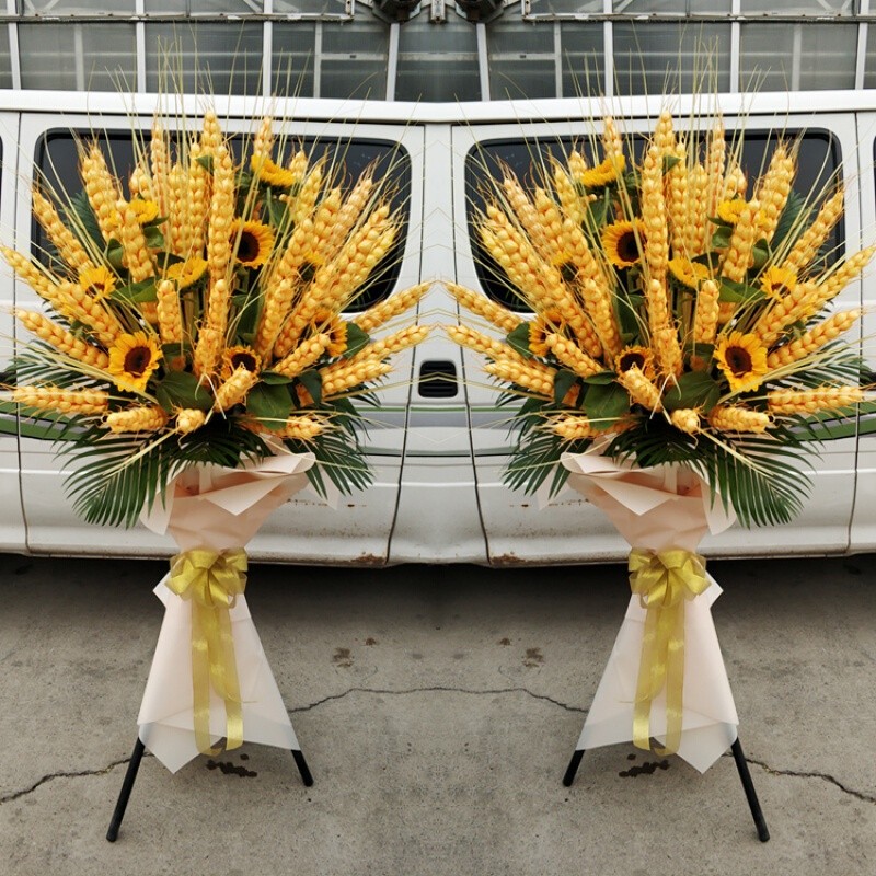 花 材:高档时尚仿真大麦,8朵向日葵,浅色欧雅纸韩式包装,金色缎带束扎。(珍贵稀少花材,请提前预定或咨询客服)