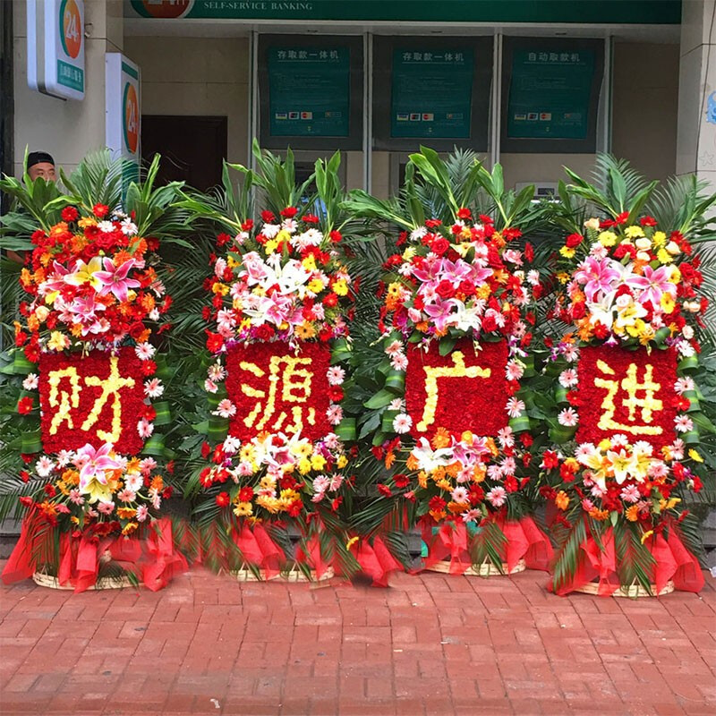 包 装:单个花篮价格(注:建议订4个,若数量不够,则没有财源广进的拼字,全部用康乃馨代替,请咨询客服再下单)