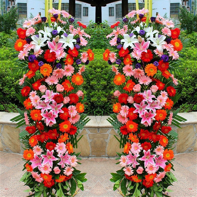 花材: 各色扶郎花三扎,粉玫瑰六朵,紫色洋桔梗一扎,百合一扎,搭配栀子叶,散尾葵,剑叶。高层花架1个。