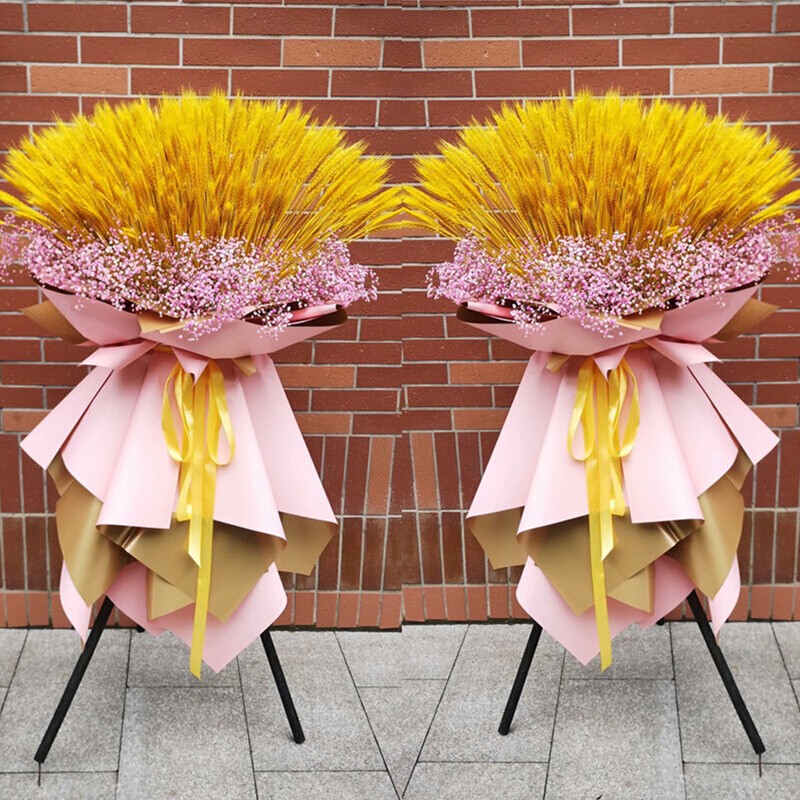花材: 大麦扇形造型,满天星底部外围环绕,粉色、金色双面纸多层包扎,金色花结。