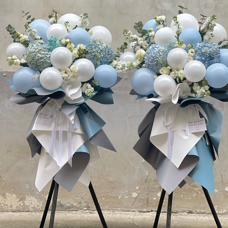 花 材:特制气球12个(蓝色白色混搭),2支绣球,6支白色洋桔梗,搭配剑兰,尤加利叶等装饰。蓝色双面纸花束包扎,白色缎带花结。