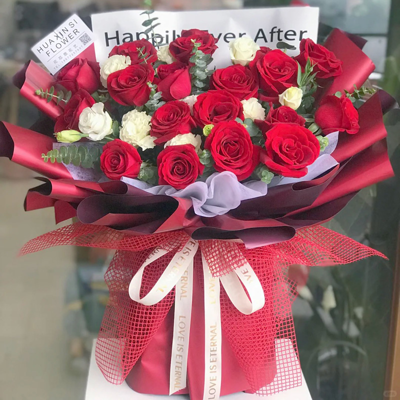【喜欢的人】19朵红玫瑰,5支洋桔梗(断货则用5朵白玫瑰代替),尤加利叶间插。
