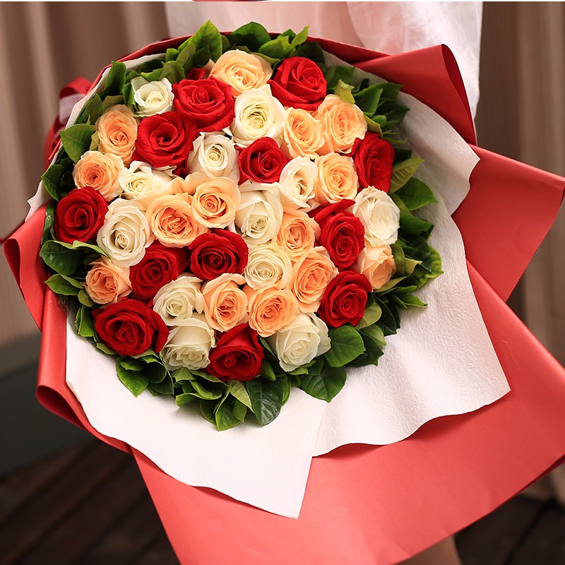 【绚烂时光】36朵混色玫瑰(红+白+香槟),搭配栀子叶外围丰满点缀。
