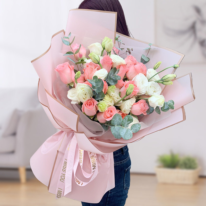 【浅浅微笑】19朵精品粉玫瑰,8支洋桔梗(可用8支白玫瑰代替),搭配尤加利叶装饰。