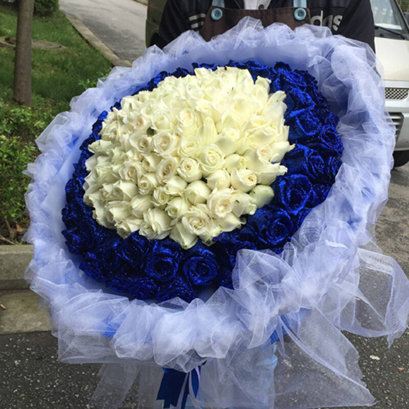 【不变的心】99朵混色玫瑰(66朵白色,33朵蓝色外围环绕)。