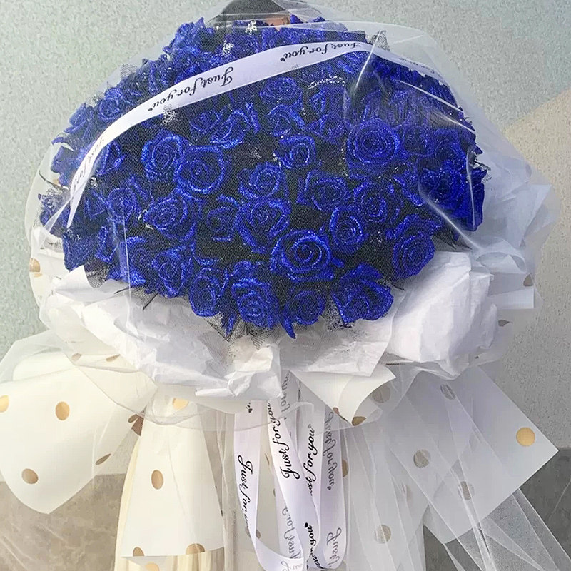 • 【蓝色传说】99朵精品蓝色妖姬,搭配紫色勿忘我外围点缀(若勿忘我不在花期,可用石竹梅或满天星代替)