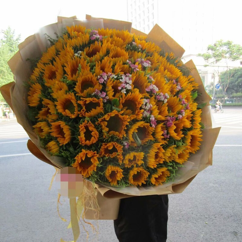 • 【暖暖情义】精选99朵向日葵,相思梅点缀,牛皮纸外包,同色系香槟色花结。