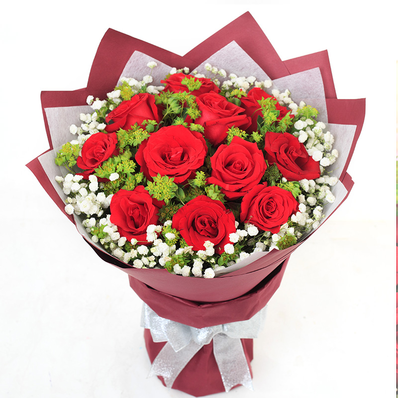 【满满的爱】11支精品红玫瑰,搭配适量白色满天星、栀子叶