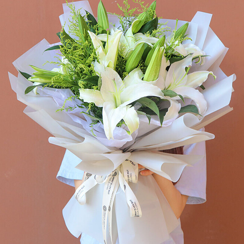 【 小幸运】精选11朵白色香水百合,搭配黄莺草、绿叶装饰。