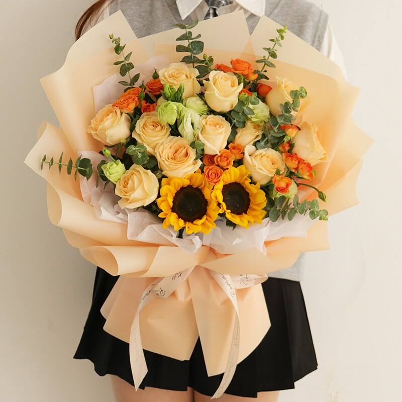 【诗歌与梦想】11朵香槟玫瑰,2朵向日葵,4支多头橙色小玫瑰,搭配洋桔梗,尤加利叶装饰。