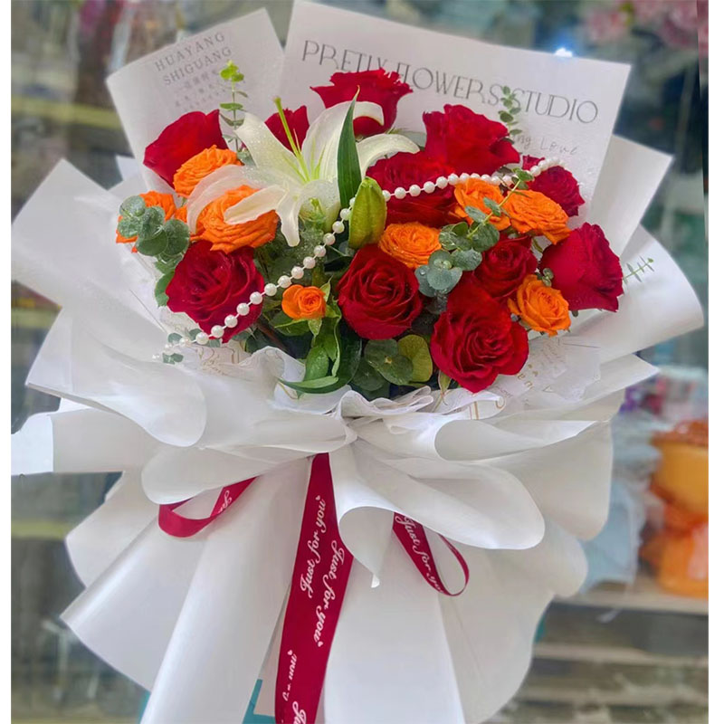 【心之守护】 11朵红玫瑰,1支白色多头香水百合,1条珠串,6支橙色多头小玫瑰(断货则用5支香槟玫瑰代替),尤加利叶间插。