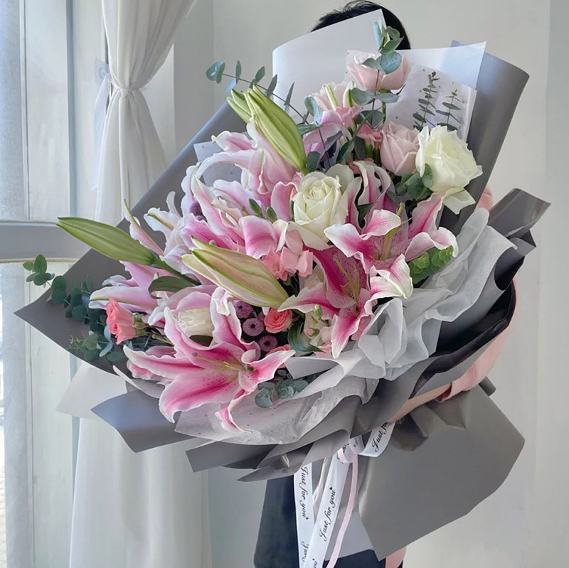 【美丽有约】6支(约18朵)粉色多头香水百合,白玫瑰、粉玫瑰混搭共11朵,搭配洋桔梗,多头小玫瑰,尤加利叶装饰。