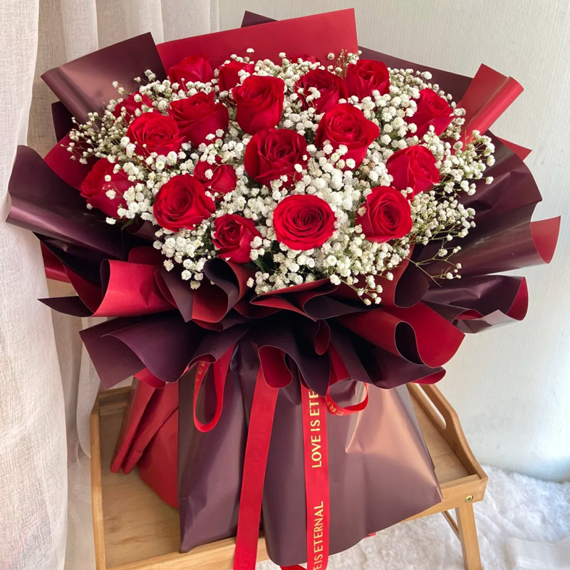 【花下浅醉】19朵红玫瑰,搭配满天星丰满间插。