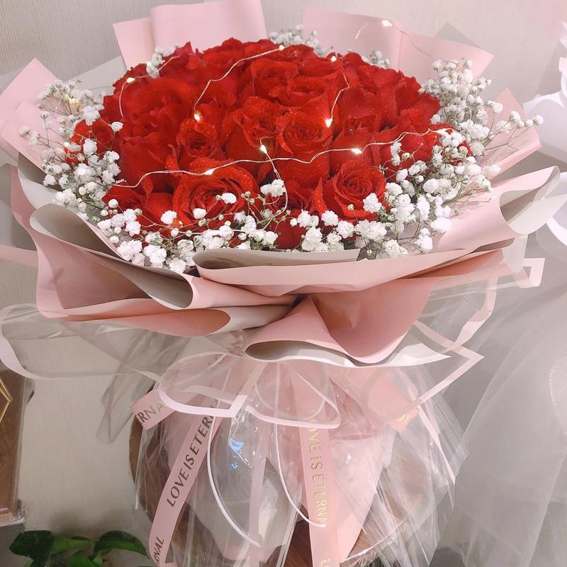 【甜蜜爱情】精选33朵红玫瑰,1条灯串,满天星环绕。