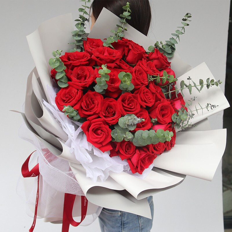 【许你一世烟火】33朵极品红玫瑰,搭配尤加利叶装饰。