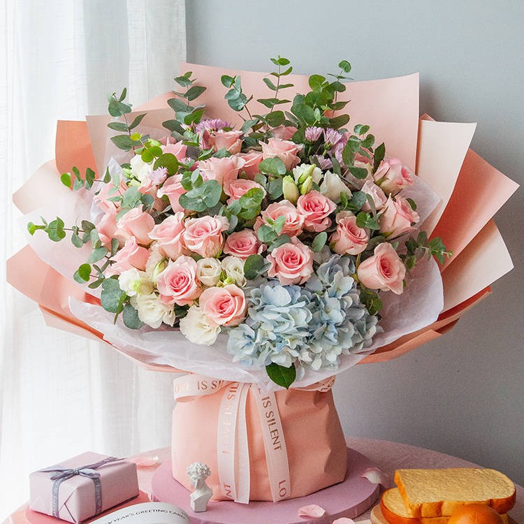 【曾经的少年】 戴安娜粉玫瑰33枝、白色洋桔梗5枝、粉色洋桔梗2枝、粉紫小菊3枝、浅蓝绣球1枝,尤加利10枝