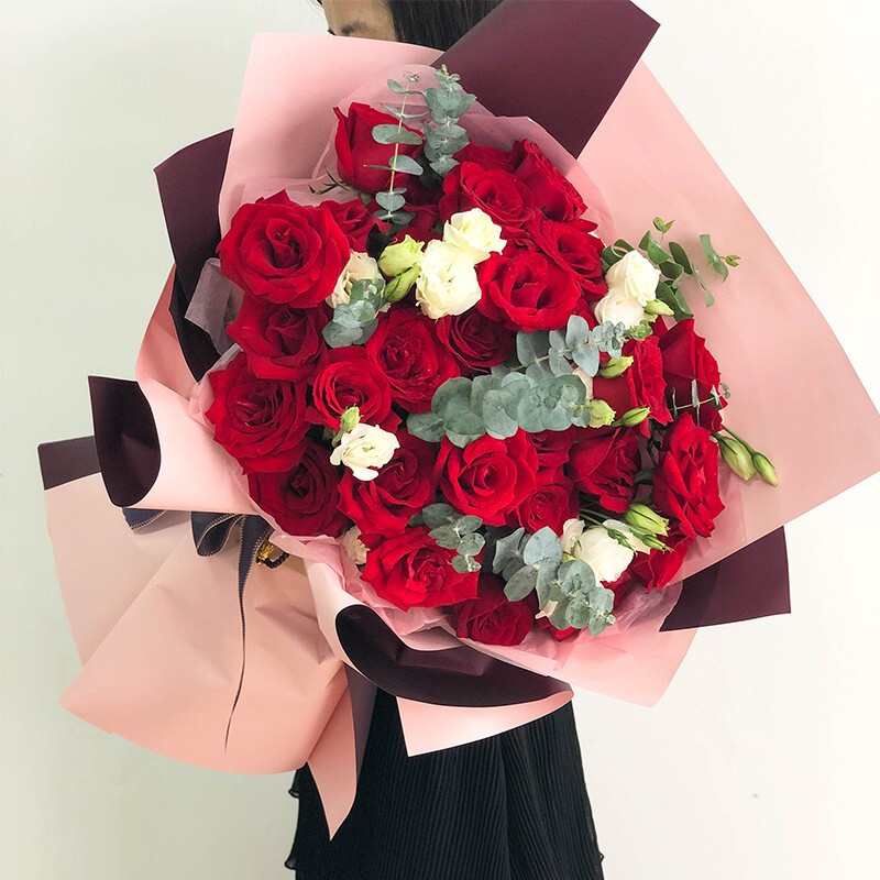 【致青春】33朵精品粉玫瑰,搭配尤加利等绿叶装饰。