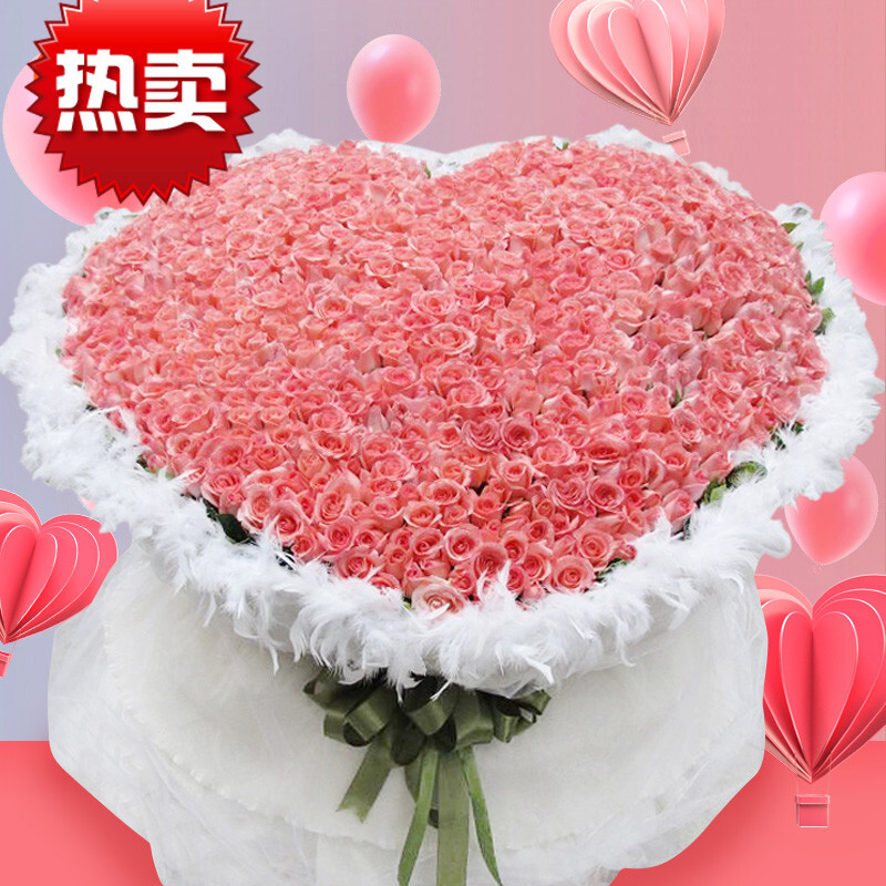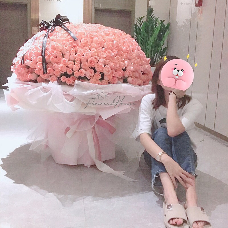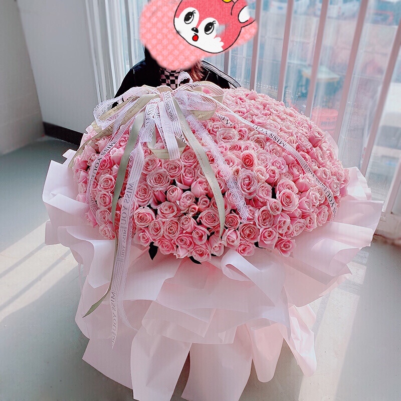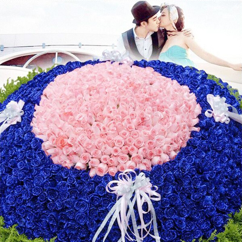 【爱你一世】999朵粉玫瑰、蓝玫瑰(粉玫瑰在内,蓝玫瑰外围),搭配黄莺等配花外围环绕,花面用花结装饰。