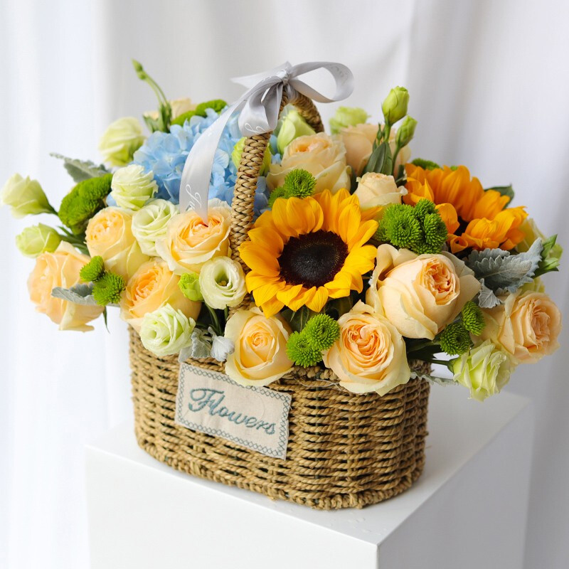 【天蓝色的问候】 1支蓝色绣球,3支向日葵,11朵香槟色玫瑰,搭配8支洋桔梗(断货则用8支白玫瑰或者橙色多头小玫瑰代替),尤加利叶间插装饰。