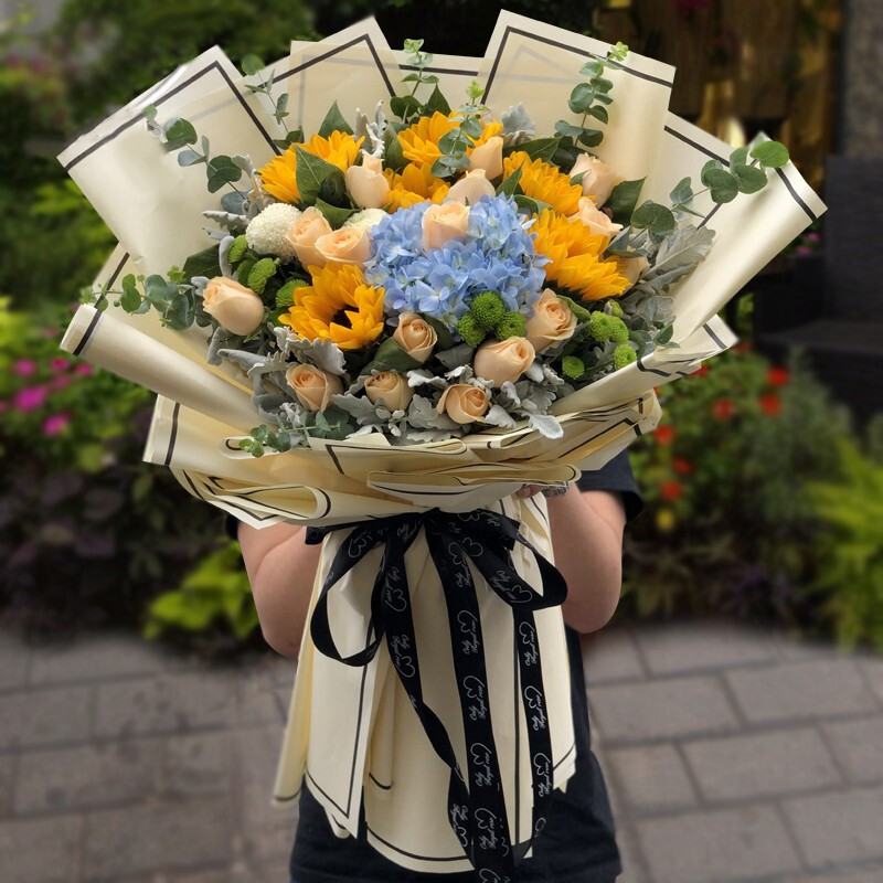 【风和日丽】16朵香槟玫瑰,5朵向日葵,1支蓝色绣球花,搭配小雏菊,银叶菊,尤加利叶装饰。