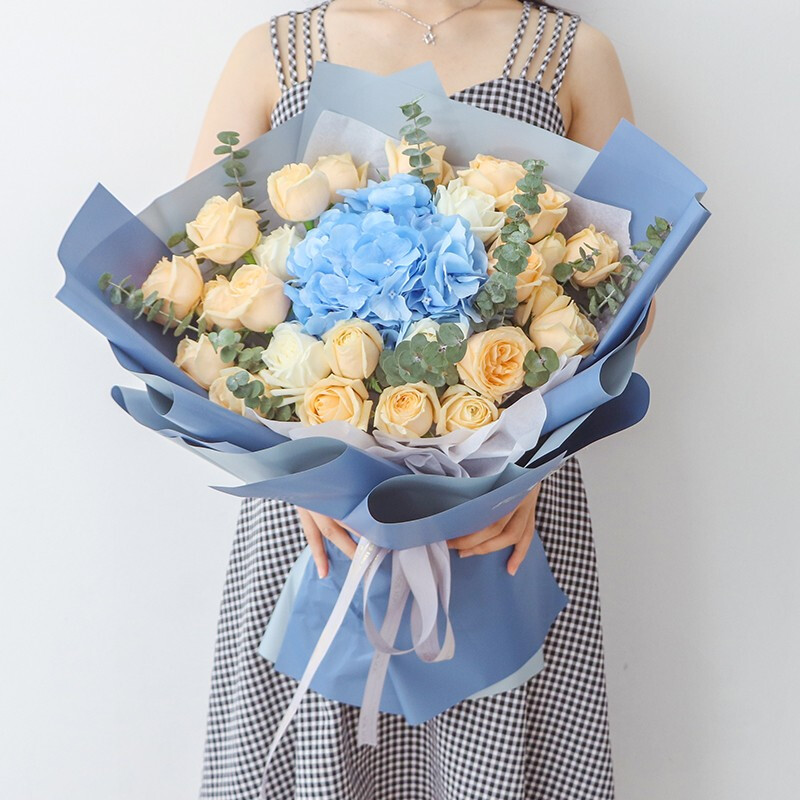 【淡云流水】21朵香槟玫瑰,1支蓝色绣球花,搭配尤加利叶装饰。