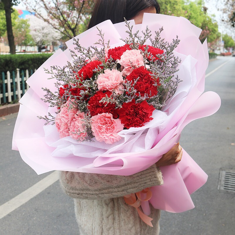 【生命里的烛光】19朵红色、粉色康乃馨混搭,搭配情人草等配花。