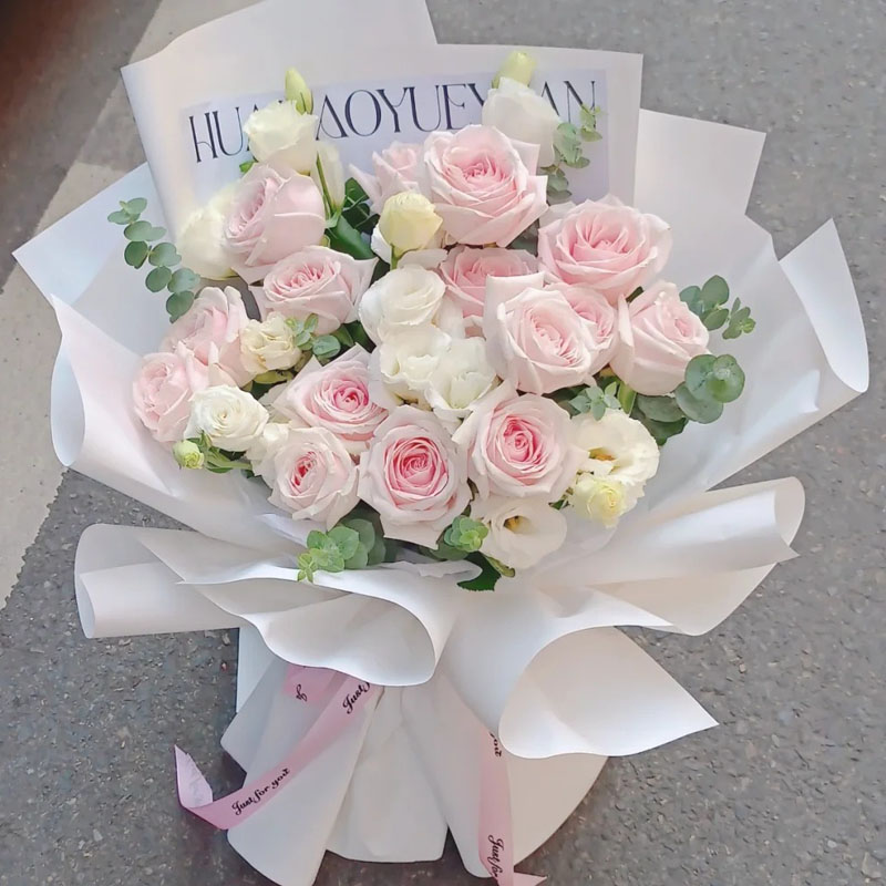 【纯情如水】精选15朵粉玫瑰,8支白色洋桔梗,搭配尤加利叶装饰。