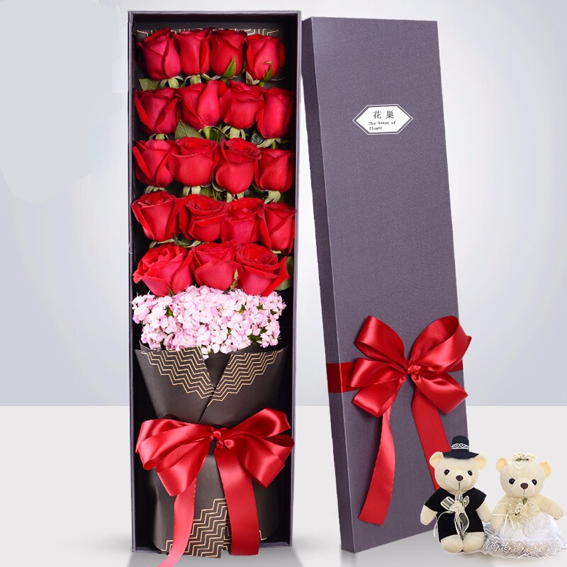 【克拉恋人】19枝红玫瑰,2只小熊,搭配满天星。