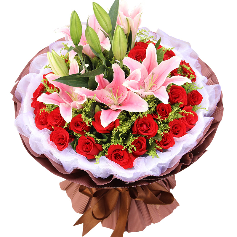 【真爱不等待】99朵精品粉玫瑰,21朵百合,满天星、黄莺搭配。