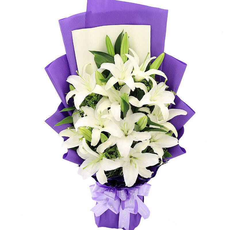 【纯洁的爱】 白百合21朵,搭配紫色勿忘我,绿叶、满天星。
