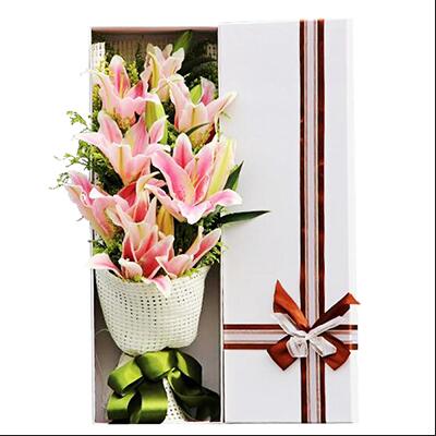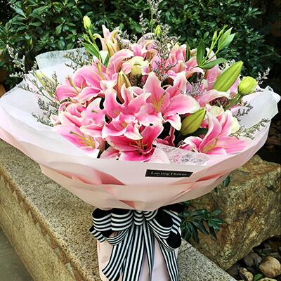 【开心如意】27朵粉色香水百合,情人草,绿叶间插。