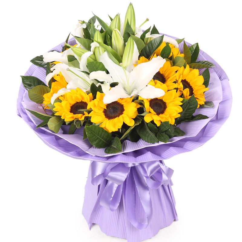 【相知相拥】11支精品向日葵,3支多头白色香水百合,栀子叶点缀。