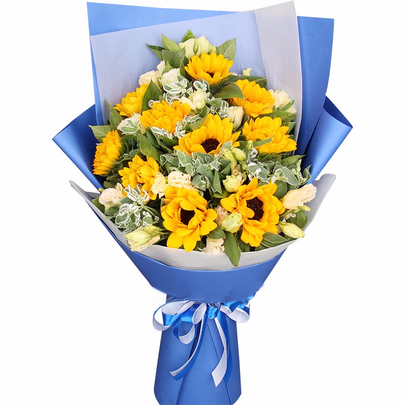 【最大的祝福】11朵精品向日葵,搭配叶上黄金、绿叶、石竹梅点缀。