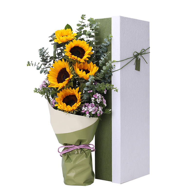 【沉默的爱】5支精品向日葵,搭配适量尤加利、石竹梅装饰。