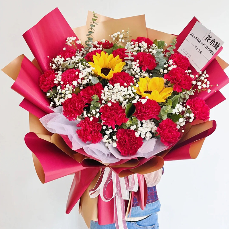 【浓情在心】19支红色康乃馨,2支向日葵,搭配尤加利叶、满天星、栀子叶装饰。