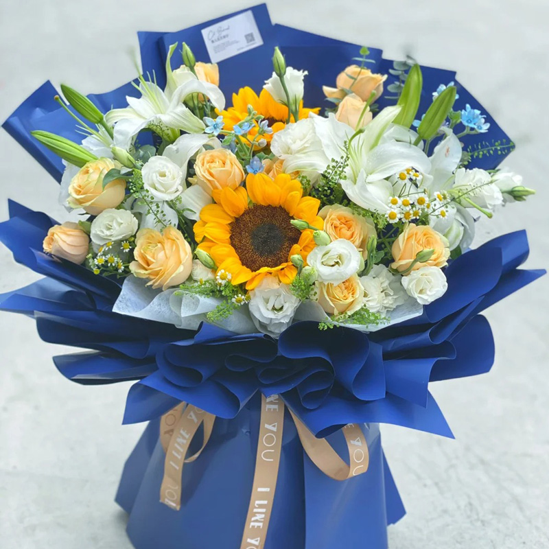 【漫步阳光】2朵向日葵,11朵香槟玫瑰,3支白色多头香水百合,搭配6支洋桔梗(断货则用同数量白玫瑰代替),洋甘菊,尤加利叶装饰。