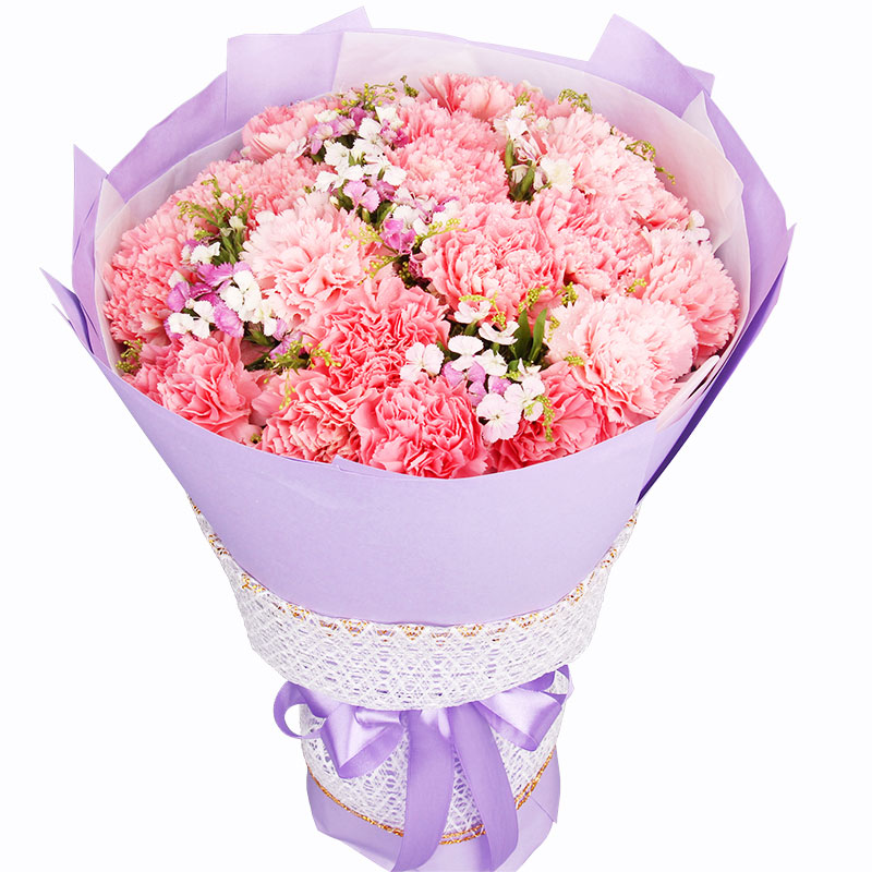 【时光的礼物】11支粉色康乃馨,搭配满天星,黄莺装饰。