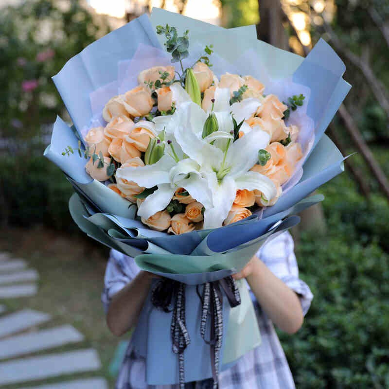 【卿若初见】12朵白百合,18朵香槟玫瑰,黄莺、栀子叶点缀。