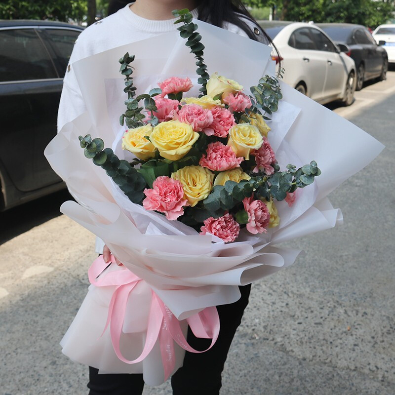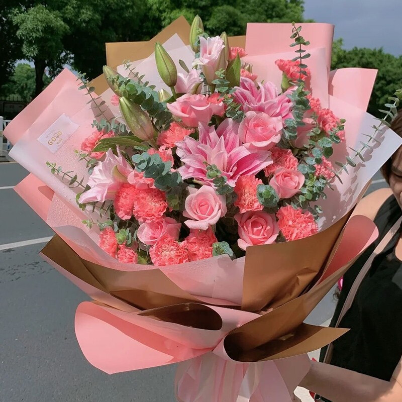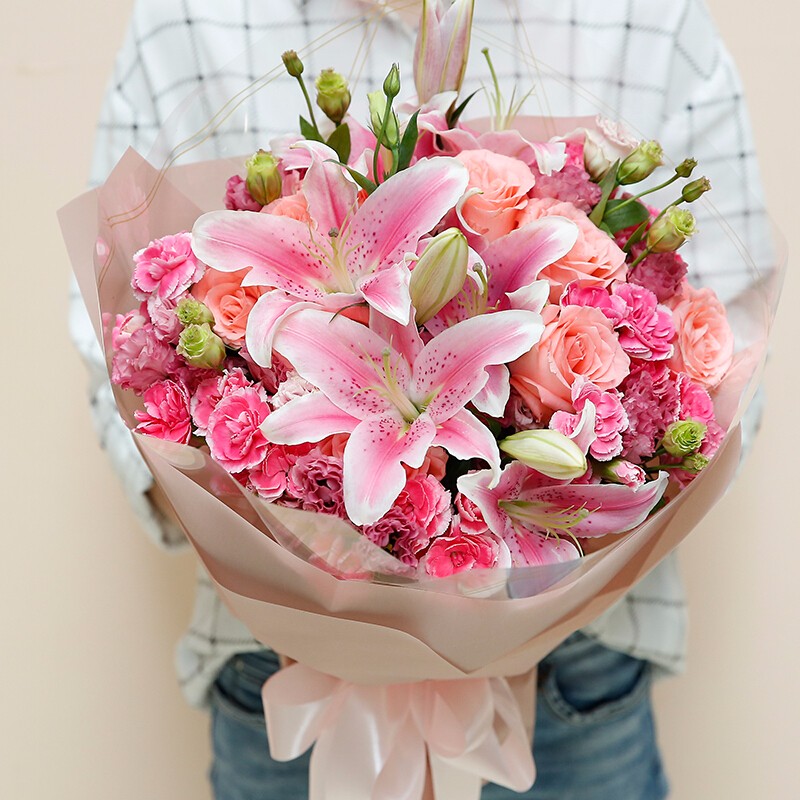 【闲云野鹤】21朵粉色康乃馨,12朵粉玫瑰,3支粉色多头香水百合,搭配尤加利叶装饰。