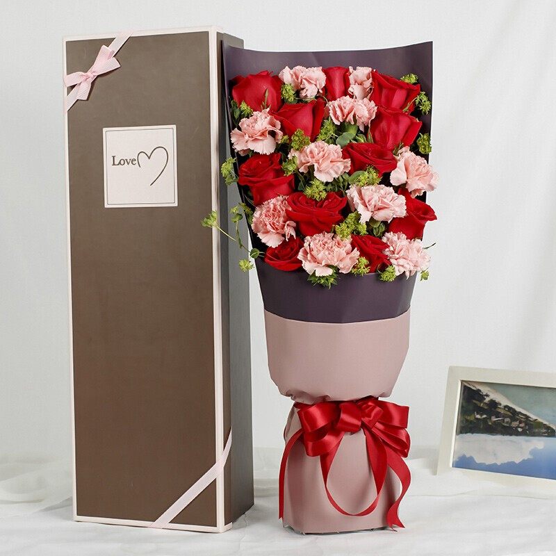 【我好想你】20朵混搭红玫瑰和粉色康乃馨(12朵红玫瑰、8朵粉色康乃馨),搭配尤加利叶、洋甘菊装饰。
