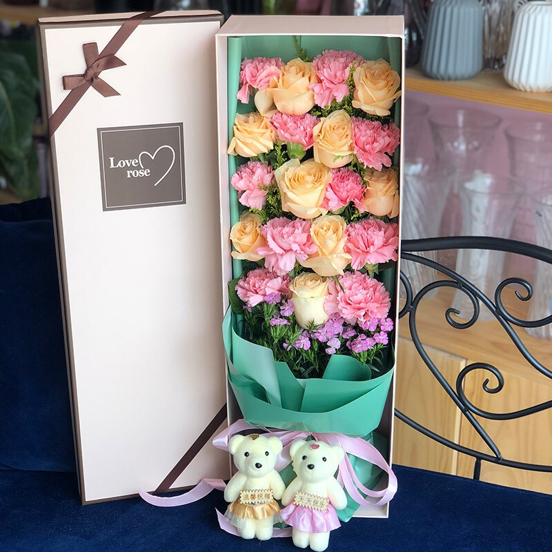 【伴风望海】19朵康乃馨玫瑰混搭(11朵粉色康乃馨,8朵香槟玫瑰),2只小熊,搭配石竹梅点缀。