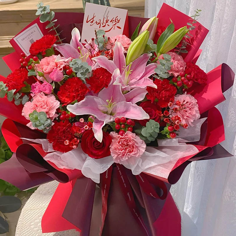 【感恩有你】16朵(红色、粉色)康乃馨玫瑰混搭,2支多头粉色香水百合,搭配尤加利叶、红豆、多头粉康装饰。