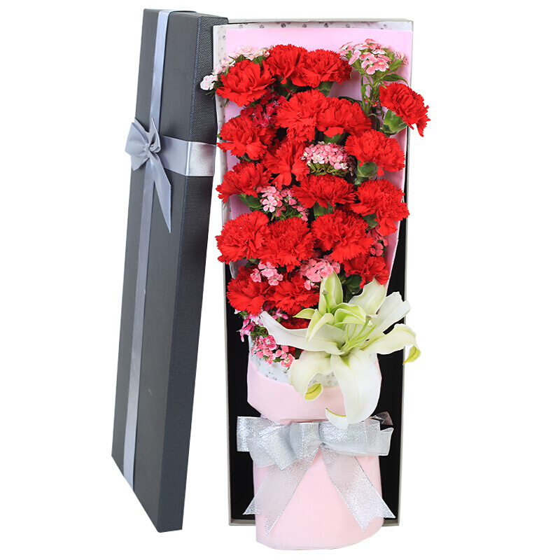 【永恒记忆】19支红色康乃馨,3支多头香水百合,搭配黄莺、勿忘我装饰。