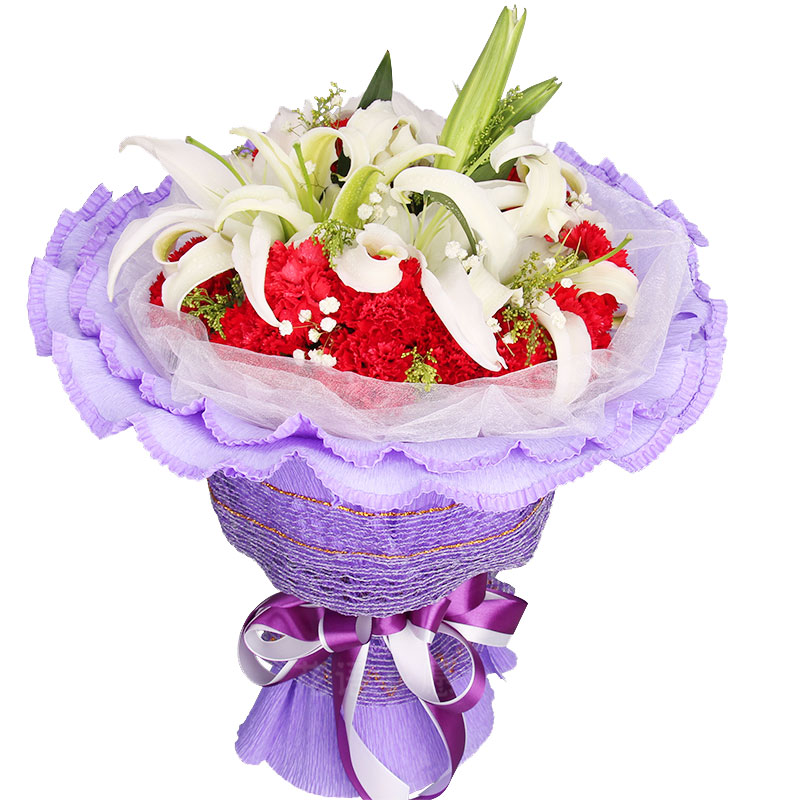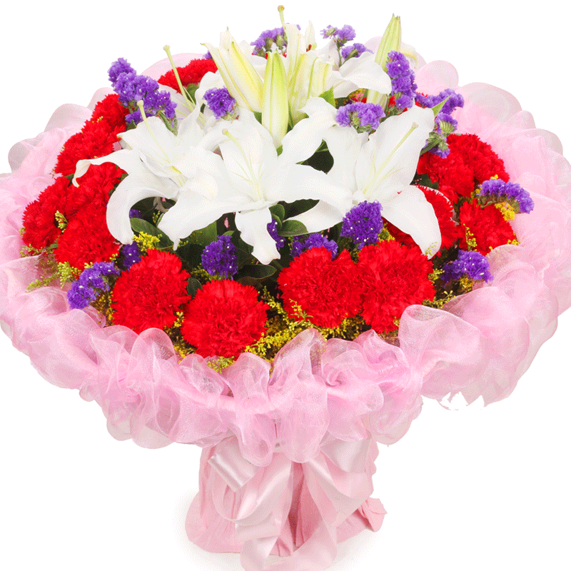 【永远祝福您】19朵红色康乃馨,2枝香水白百合,搭配满天星、黄莺点缀。